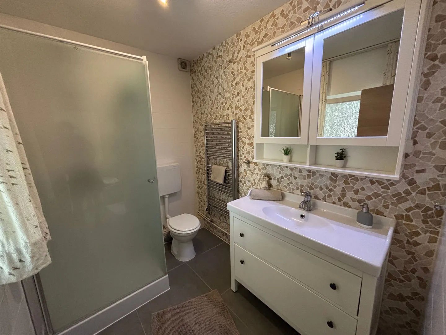 Bad mit Dusche. WC. Waschbecken.