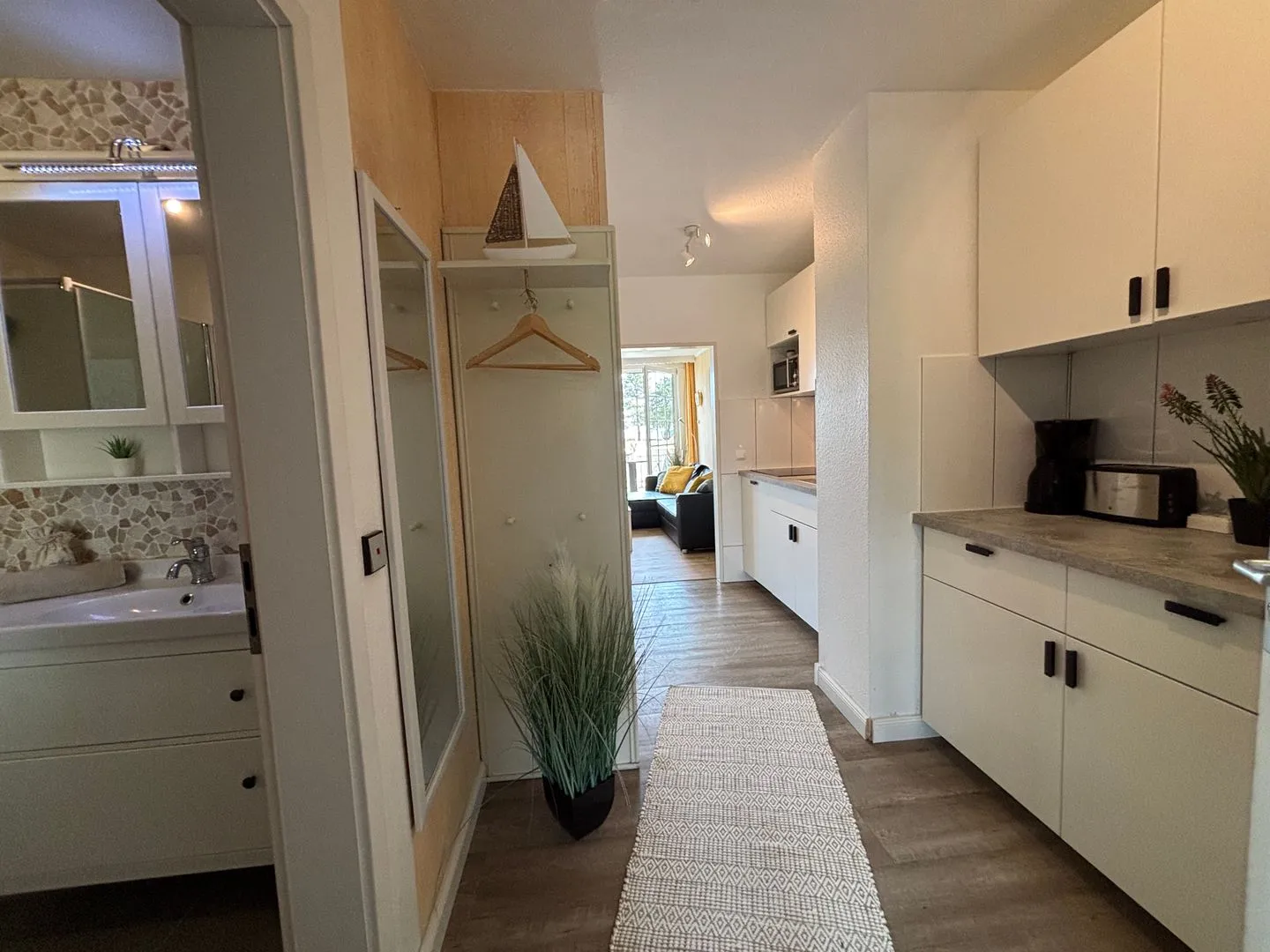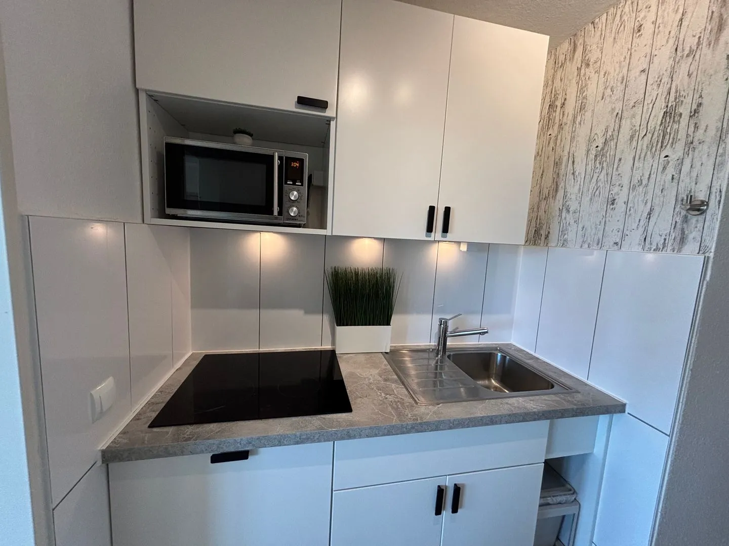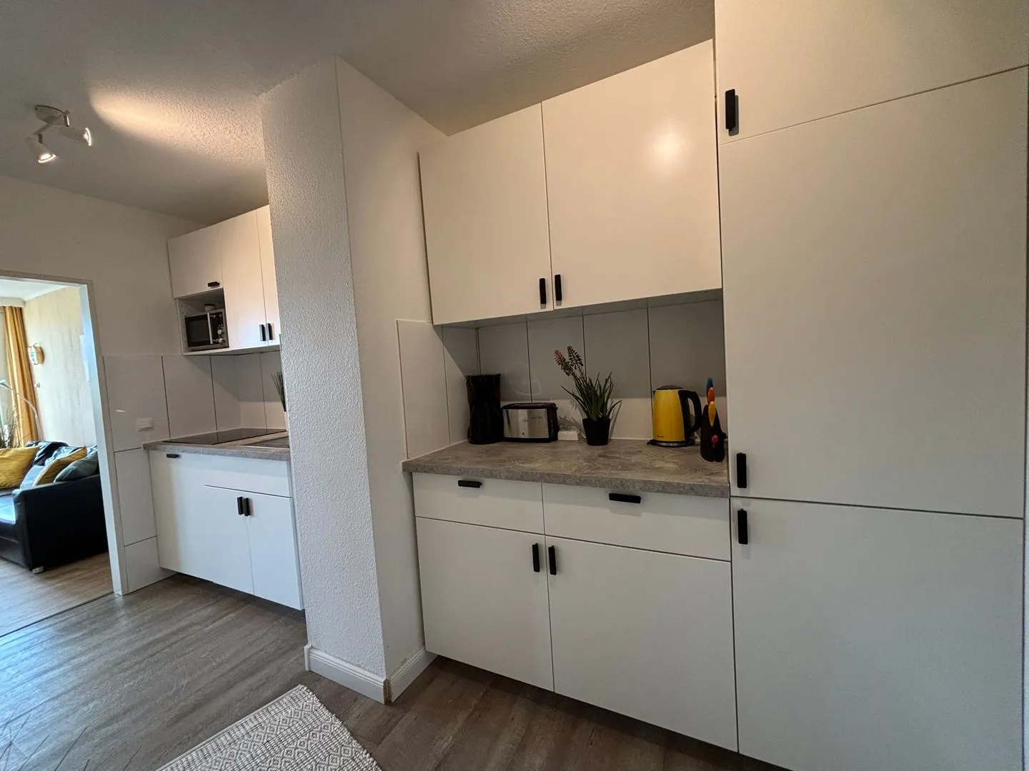Ceranfeld mit 4 Kochzonen. Kaffeemaschine. Toaster. Eierkocher. Mikrowelle. Geschirrspüler.