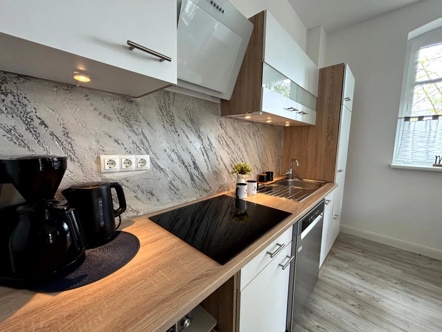 Ceranfeld mit 4 Kochzonen. Kaffeemaschine. Toaster. Eierkocher. Mikrowelle.