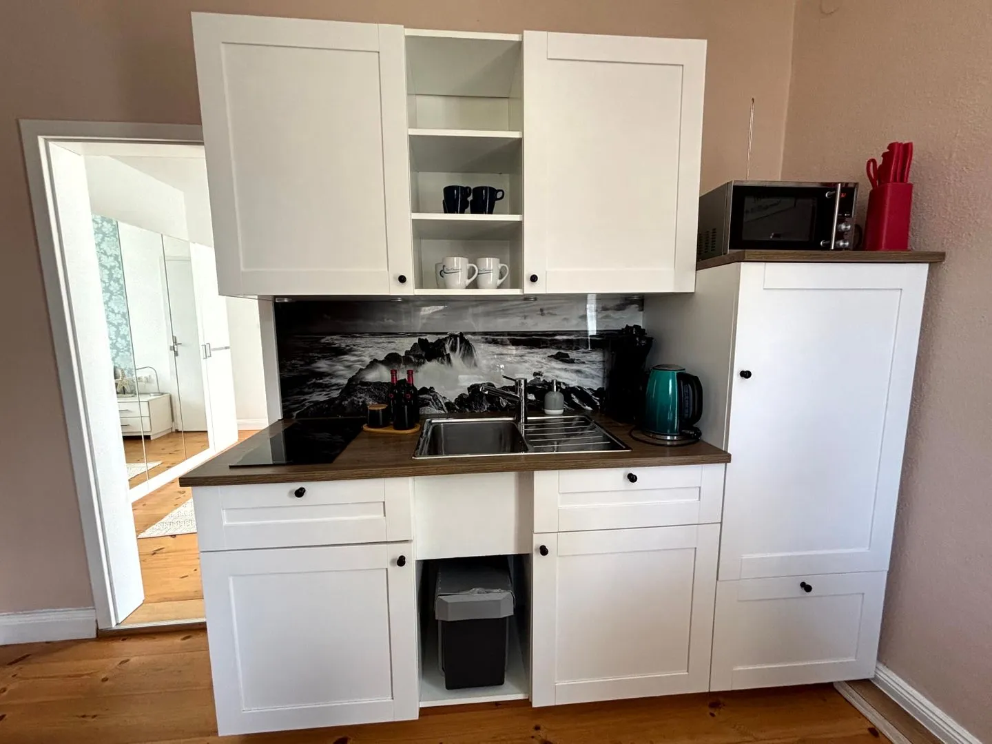 Ceranfeld mit 4 Kochzonen. Kaffeemaschine. Toaster. Eierkocher. Mikrowelle.