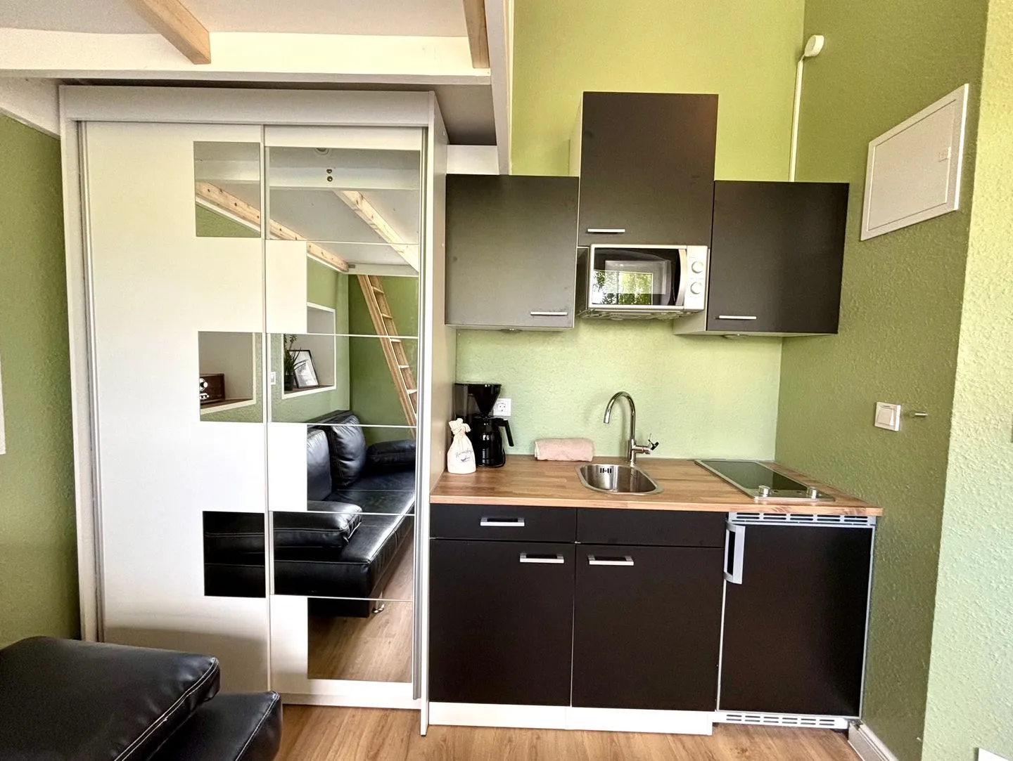 Küchenzeile 1,50 m Länge. Kühlschrank. Zweiflammen-Kochstelle. Mikrowelle. Kaffeemaschine. Toaster.