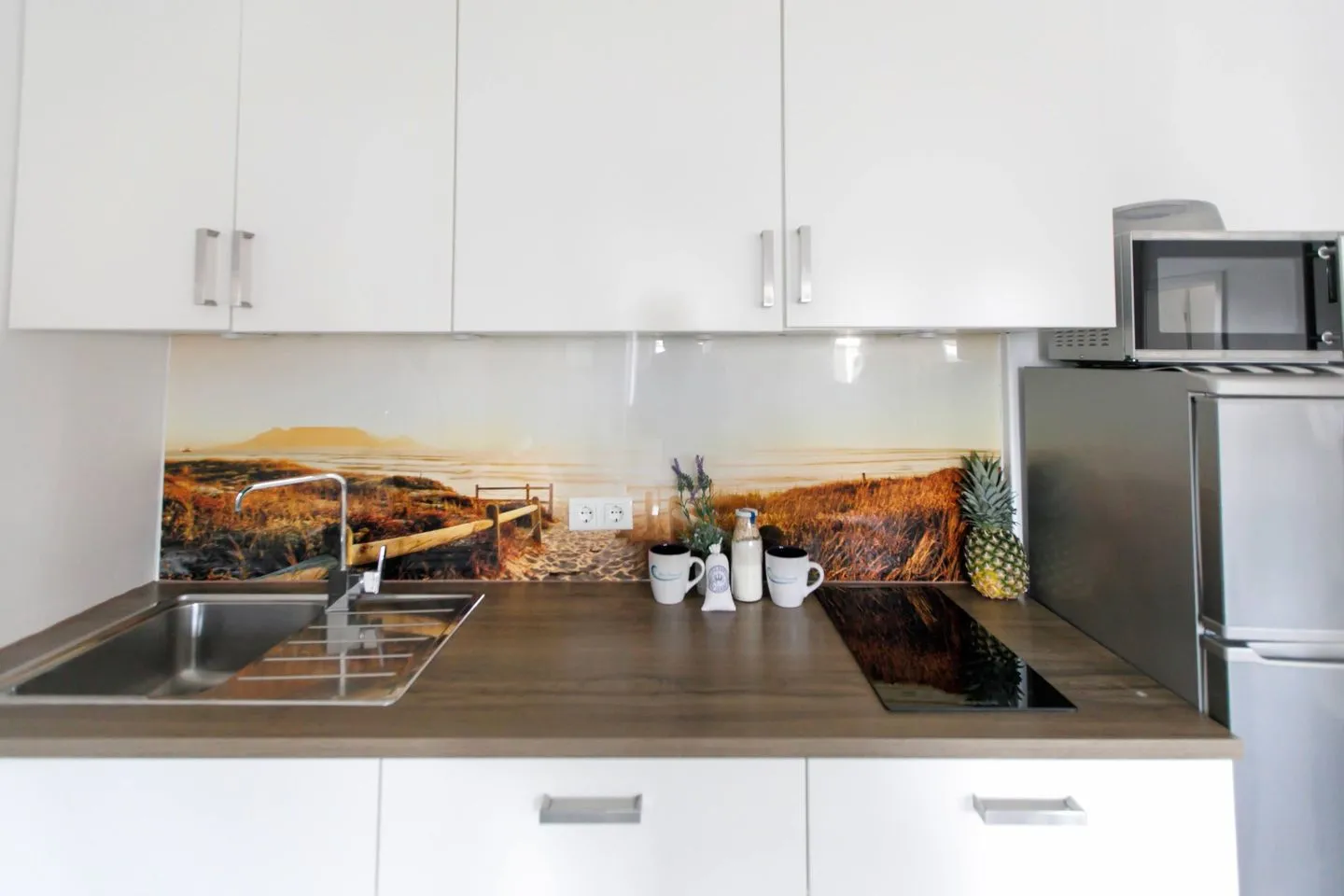 Ceranfeld mit 4 Kochzonen. Kaffeemaschine. Toaster. Eierkocher. Mikrowelle.